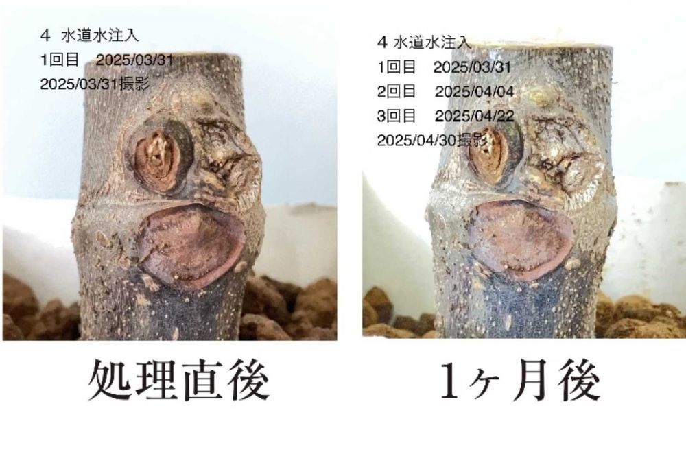 その結果、処理1ヶ月後に納豆菌懸濁液を注入したすべての穂木で発芽が認められました 一方、対照の水だけを注入した穂木はまだ発芽しておりません