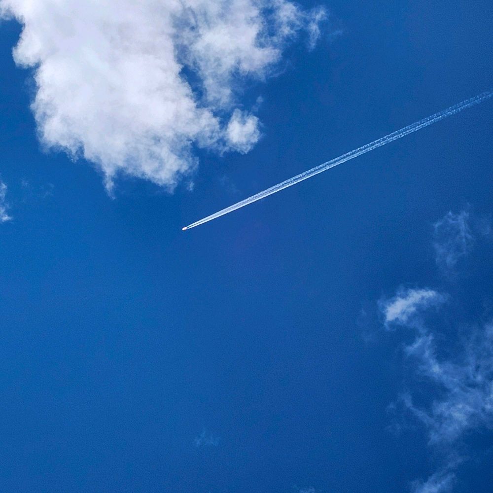 空を見上げると ぬけるような青空で飛行機がスッと線を引くように 西の方に飛んでいきました。