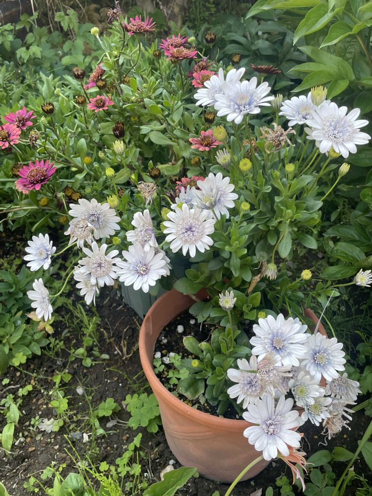 ⑤冬越しした オステオ シルバーナイト も 咲いてきて 花壇が賑やかです