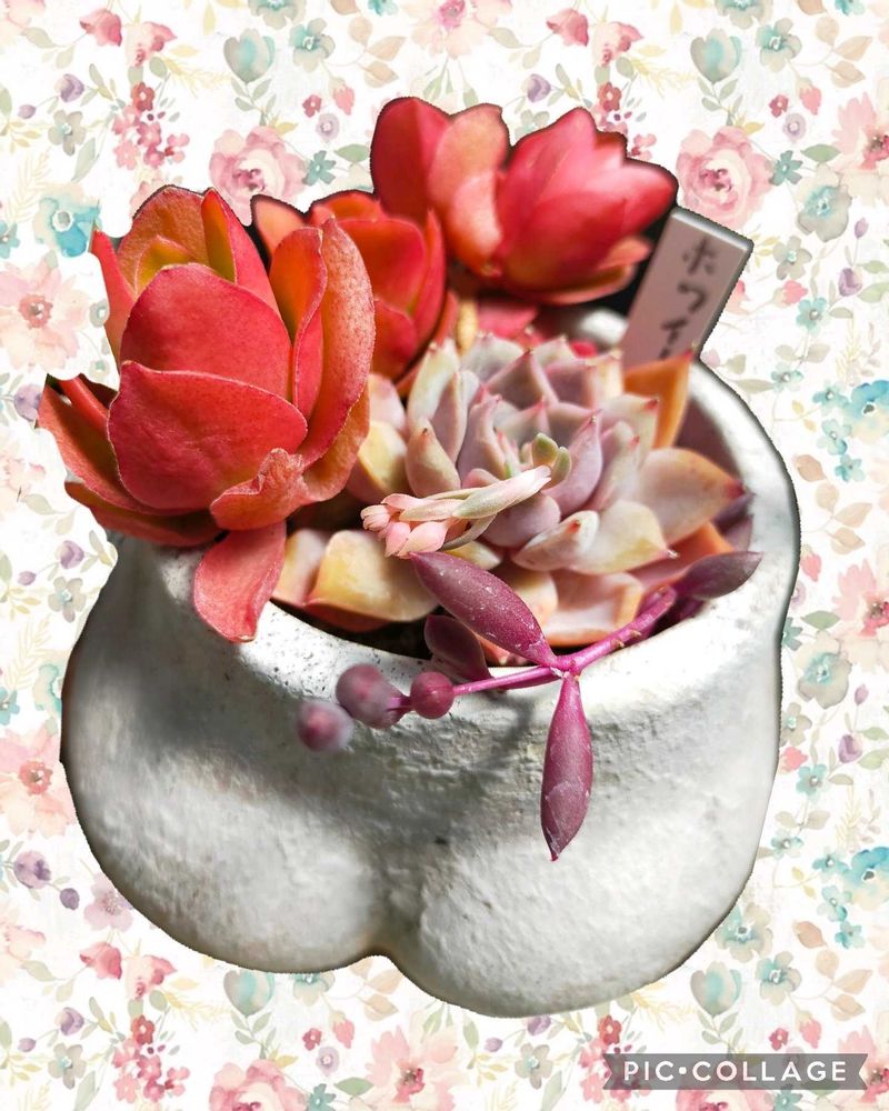 オケツ鉢の左の赤い多肉さん、名前分からなくて💦何だろう?火祭りじゃないよね〜?🙄💭