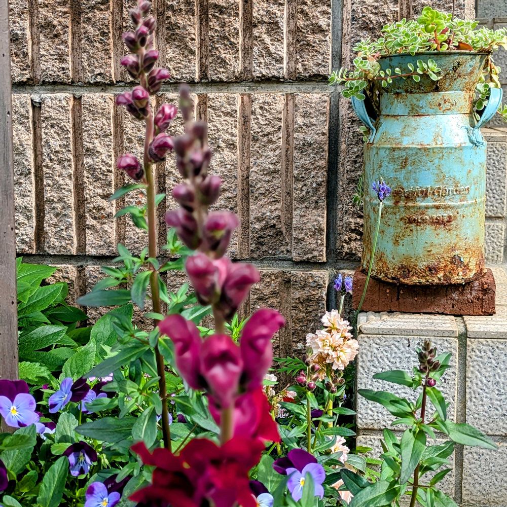 お花はミニチェリーコーラ(金魚草)ブロンズ色の葉に深いベルベットの様な赤が素敵です♪