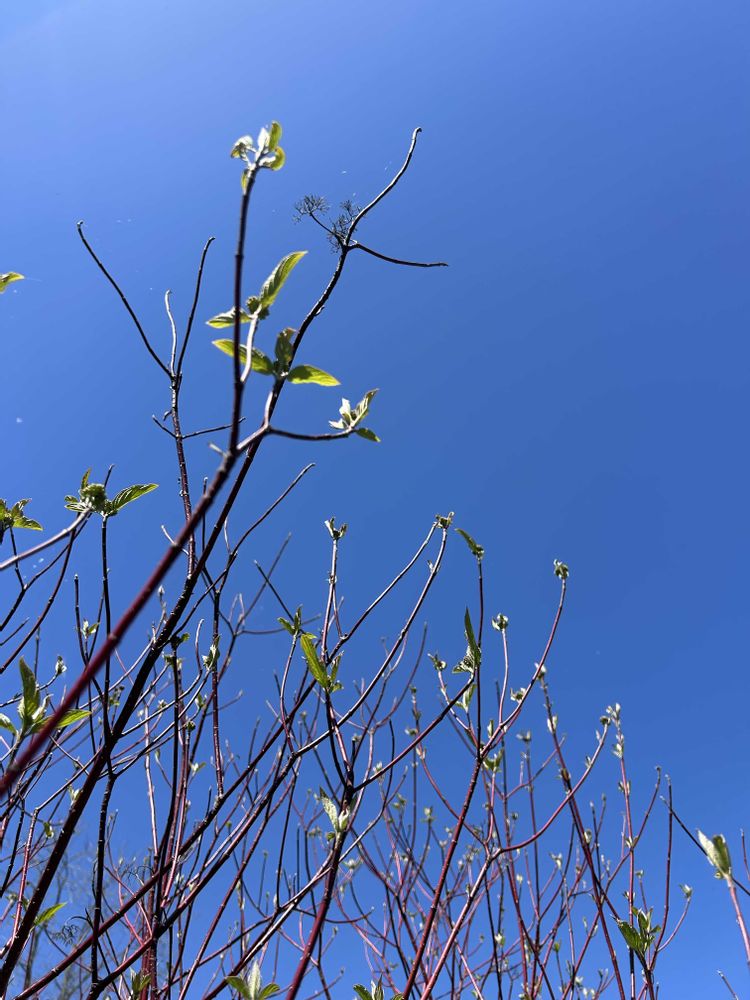 3、サンゴミズキの新緑が、青空に伸びて、強さを感じます。