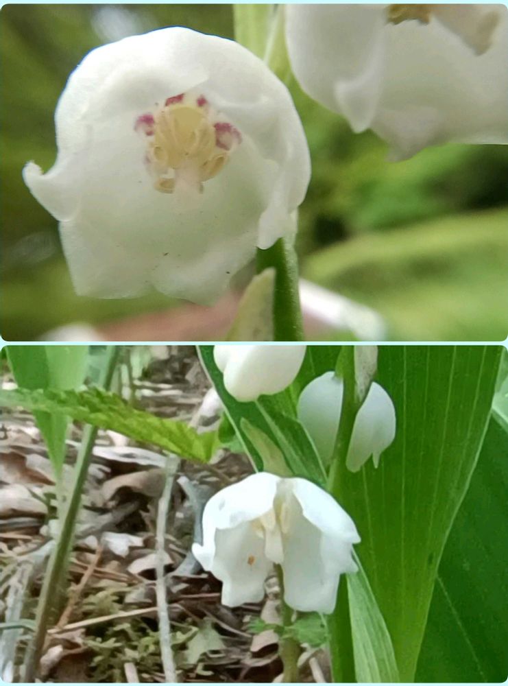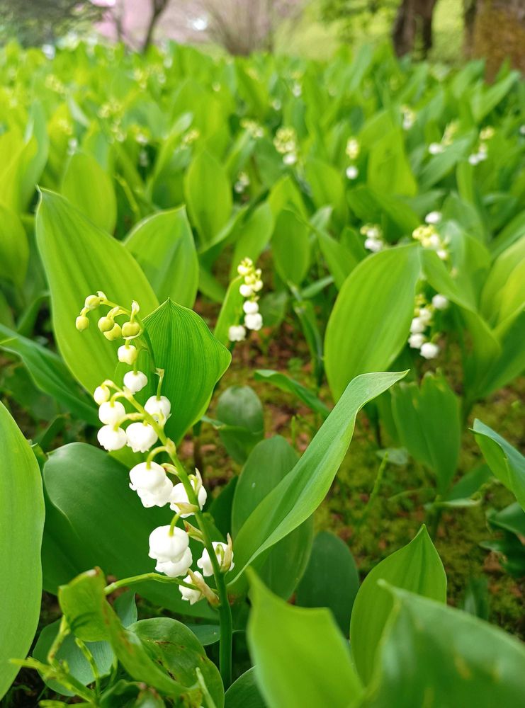 5月の初投稿〜スズラン〜大好きな花なんです〜まこちゃんの説明でドイツか日本かスズランの見分け方が良く分かります〜そして、それ以上にビックリはスズランの中〜覗いた事無かった〜シベがピンク〜可愛い〜コレはドイツ?日本は白いんだね〜覗いてみよう〜🤭🤍✨
