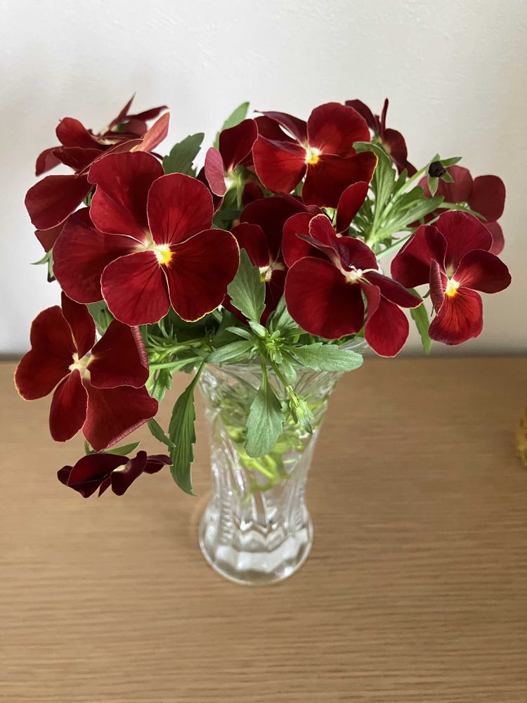 ❷は、よく咲くスミレは3種類お迎えしていましたが、このワイン色🤎🍷のクランベリーだけ徒長しまくって✂️で、もう最後に〰️〰️