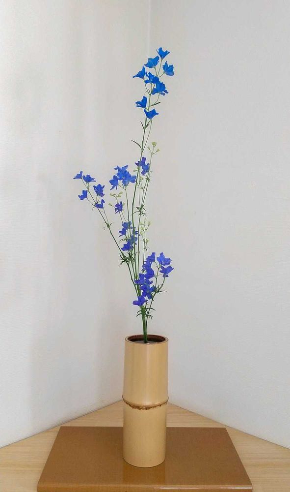 デルフィニウ厶の一種生けが、竹器に、似合ってます背丈も高いので、
