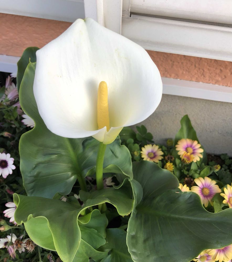 我が家の小庭。 植えた記憶がないのに葉ばかり大きくなったカラー。その『 カラー 』さん、昨日仕事を終えて帰宅したら花開き、満開でした。 お帰り!と言ってくれているようでした。😅