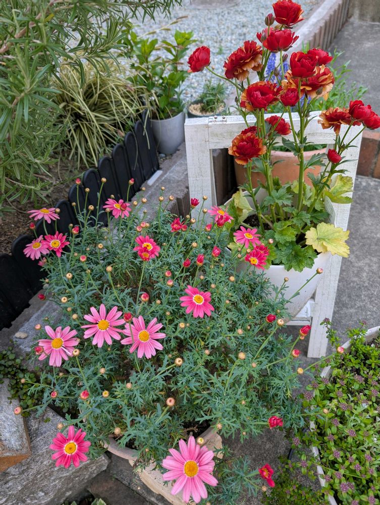 今朝庭🏡ラナンキュラスラックスと、マーガレット。