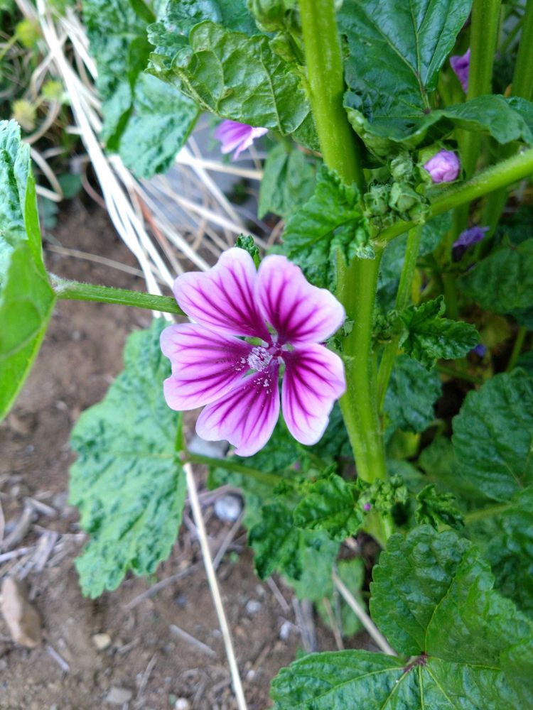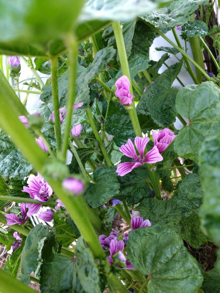 ①②はゼニアオイ(コモンマロウ、モルチアナ)。花言葉「初恋」「温和」「深い恩愛」など。