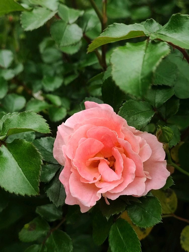 ドリフトローズ ピーチ(小輪)は小さいシュラブかブッシュって感じ。蕾はケルナーフローラ。大きいシュラブ。王様の杖っぽくてかっこいいです。