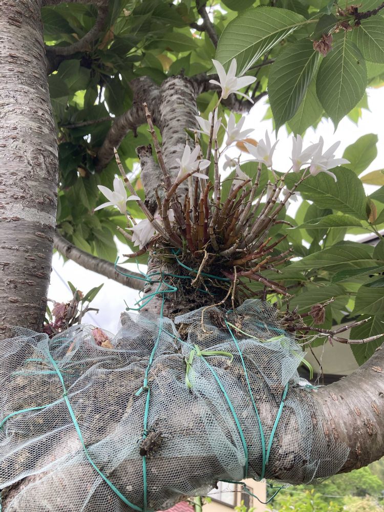 苔が風に飛ばされないように、シンクで使う〈生ゴミ受けの網〉で、セッコクの根と水苔を包んで、幹に針金で巻き付けています。私だけかも(笑)