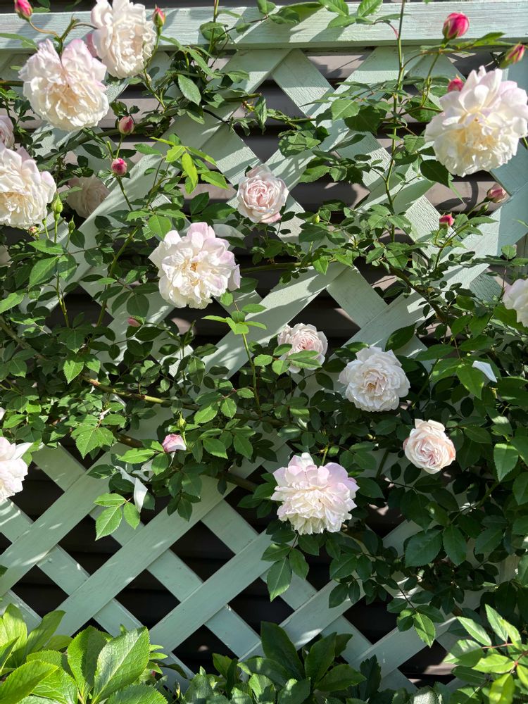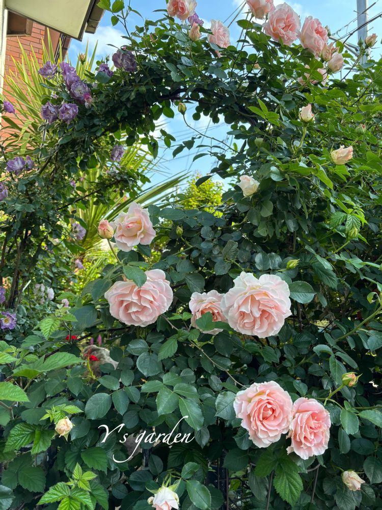 ①ロココとブルーフォーユーのアーチ 我が家のクィーンのロココ様が咲き出しました。どちらもガンガン伸びるのでアーチにしちゃいました。