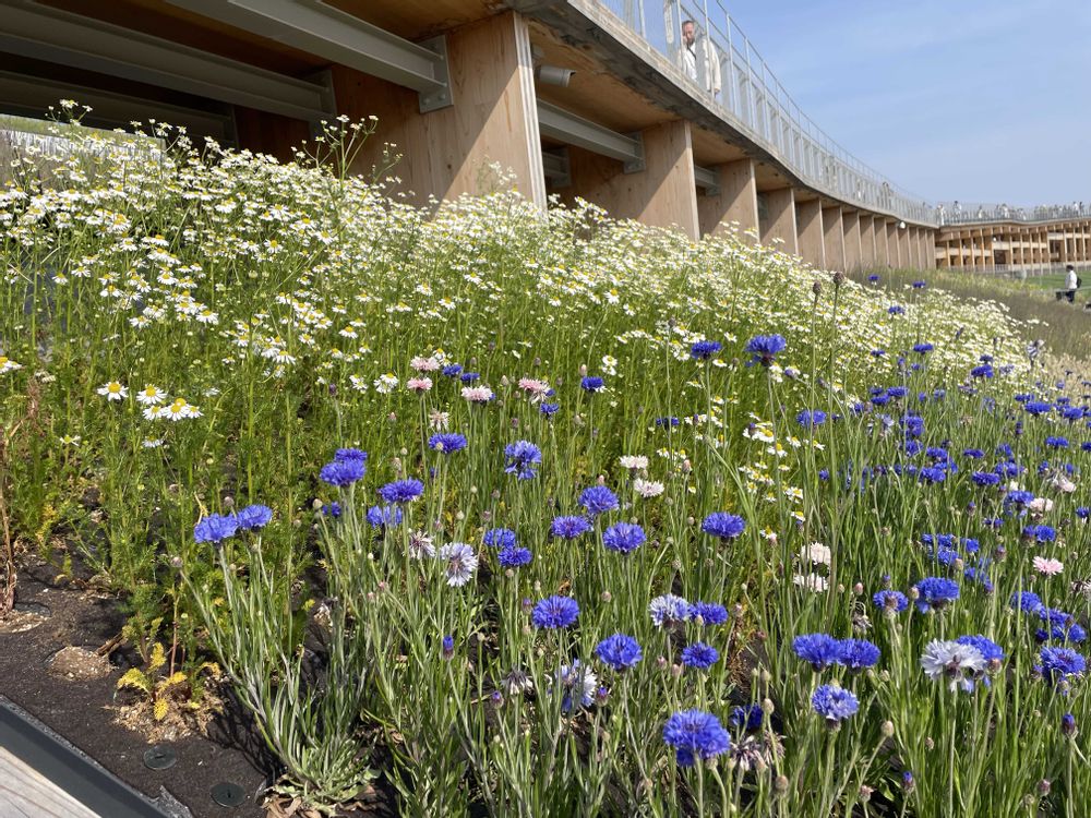 大屋根リングの一角。ジャーマンカモミールとヤグルマギグ。カモミールが清々しい香り。