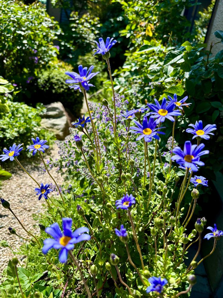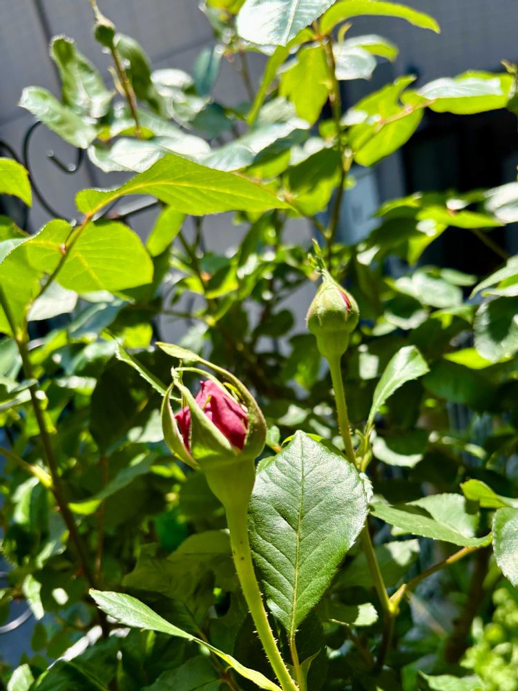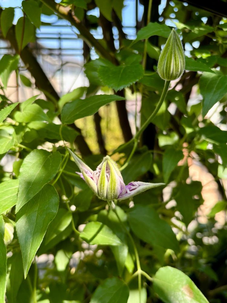 ☀️🌀28℃西風ビュービュー今日の庭😆🌹薔薇もクレマチスも✨もうチョットの辛抱💙青空にブルーや紫の花がよく似合う🥰💕