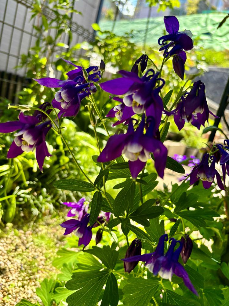 ④こぼれ種オダマキ💜同じ様でも下向きと上向き、色が微妙に違うね💕