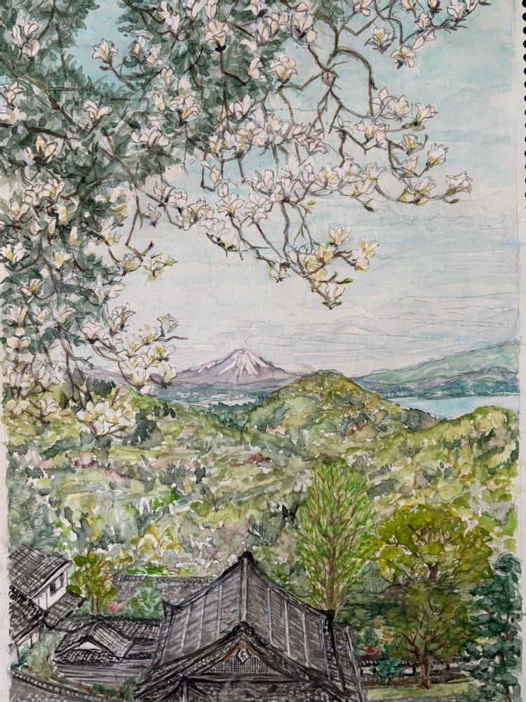 ⑤一畑薬師からのスケッチ😅白木蓮が上手く描けない💦お粗末ですが春の風景🗻
