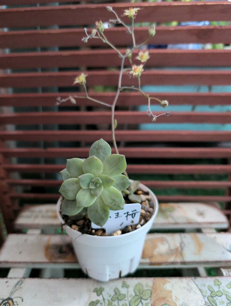 花芽が長く伸びて折れてしまい隣に植えました。ミニチュアの木みたいです。胴切りして葉挿しを取りたいけど勇気が出ません(^_^;)