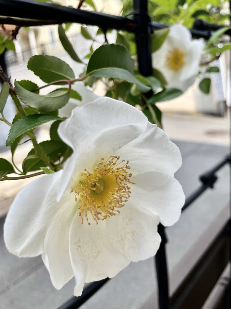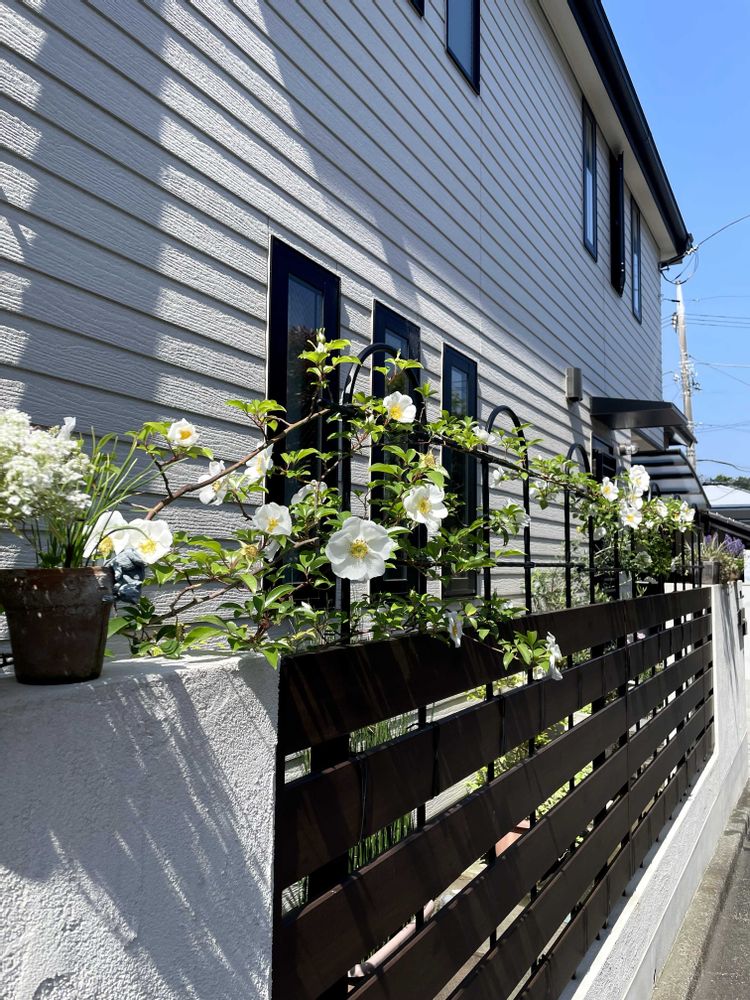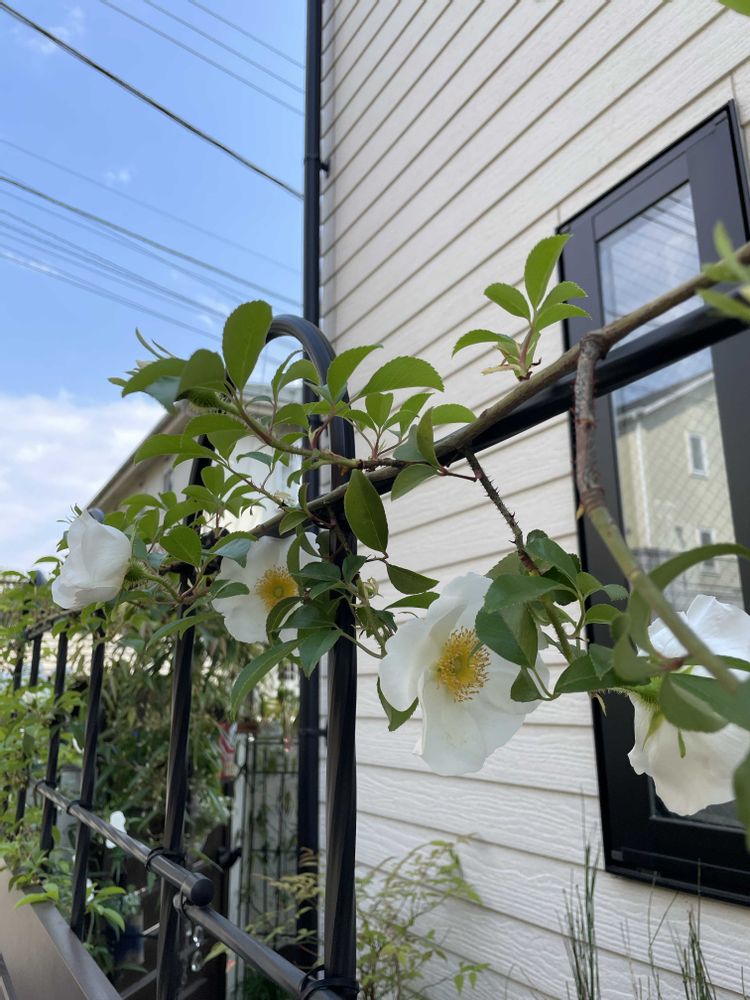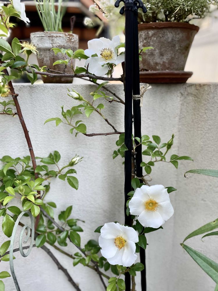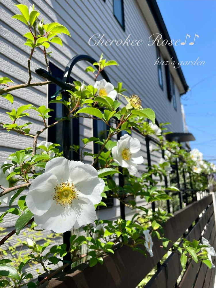 フェンスに絡ませた白いナニワイバラ、素敵ですね〜💓