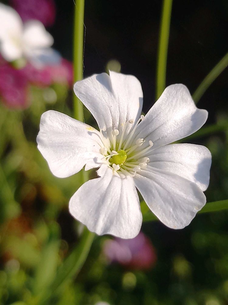 可愛いスズランと陽を浴びたカスミ草、ペチュニア、サフィニア…