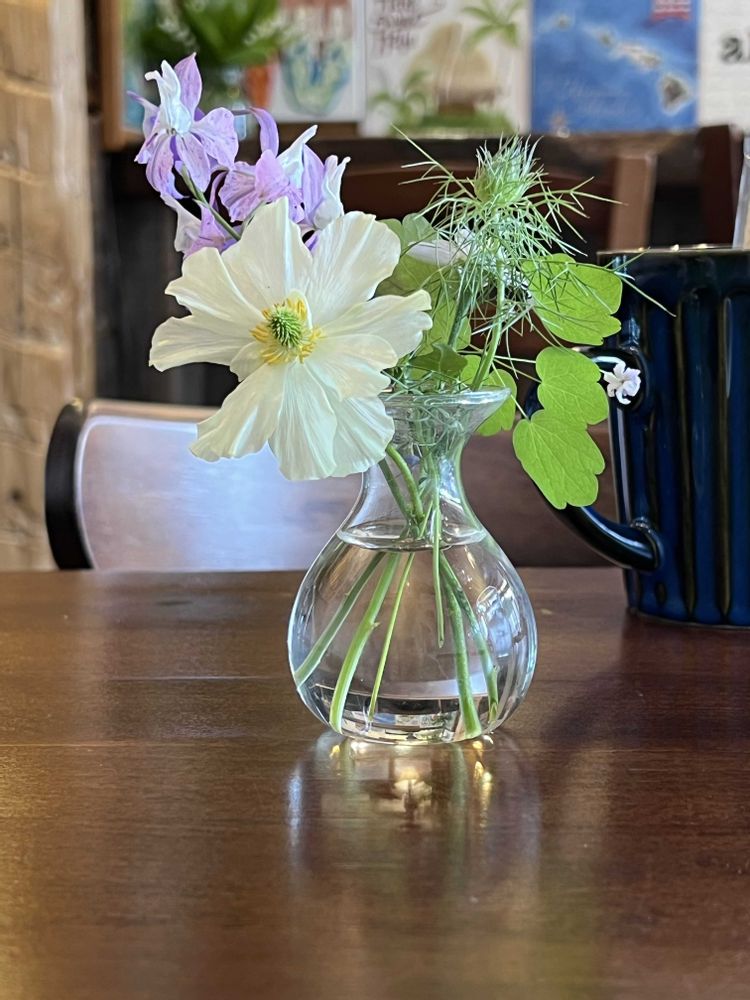 街の小さな食堂の心遣い。webでは、コスモス、チドリソウ、ニガナと教えてくれましたが•••?