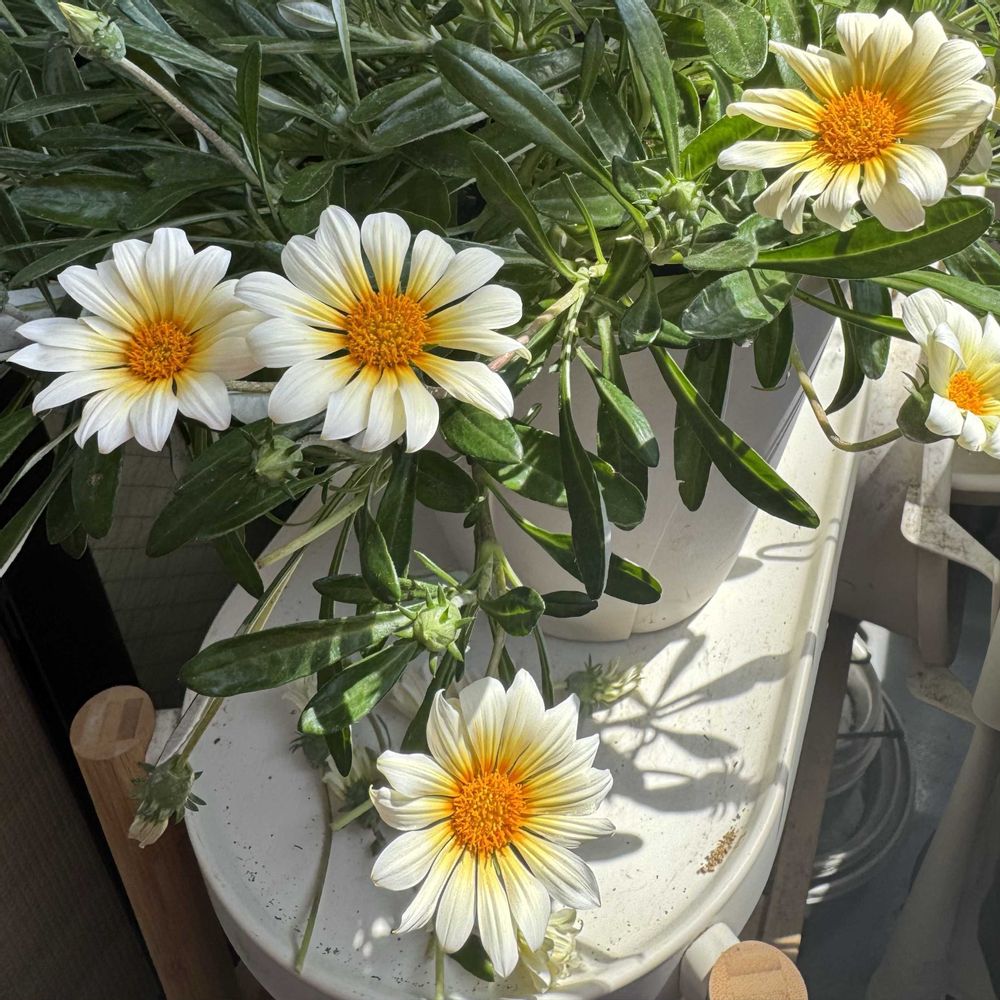 pic3 ガザニアビースト「カナリアスマイル」 6.5号くらいの鉢でめちゃくちゃ育ったので8号鉢に植え替えました。横に広がる感じに育っているのでどうするか悩みどころ。お花キレイですが園芸品店の春苗に咲いてるお花の迫力がすごく「ビースト」の命名に納得しました。