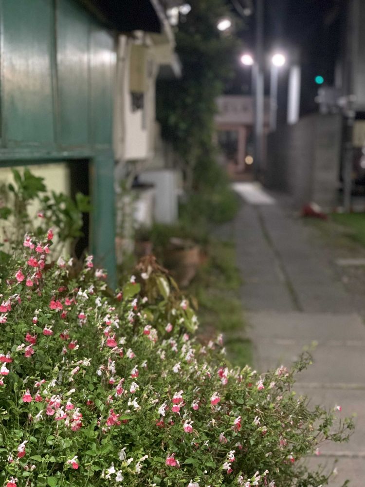 鎌倉夜道とチェリーセージ。ある少年がチェリーセージの花を五つくらいむしって蜜をまとめて吸うんだ、と教えてくれた。道奥にうっすら見えるのは、ジェラート🍨屋さん。