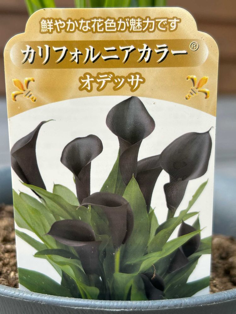 黒いカラー、葉っぱも白い柄入、咲いたら素敵な感じじゃない⁈と思って、安かったしで、一緒に帰宅。