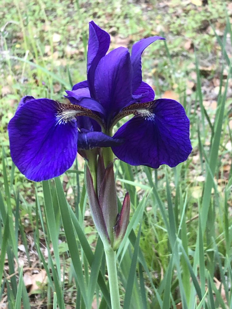 夕暮れ時、桜通りの「あやめ橋」交差点近くにて、紺色のお花「アヤメ」をパチリ!📸💙🌿😊🌇