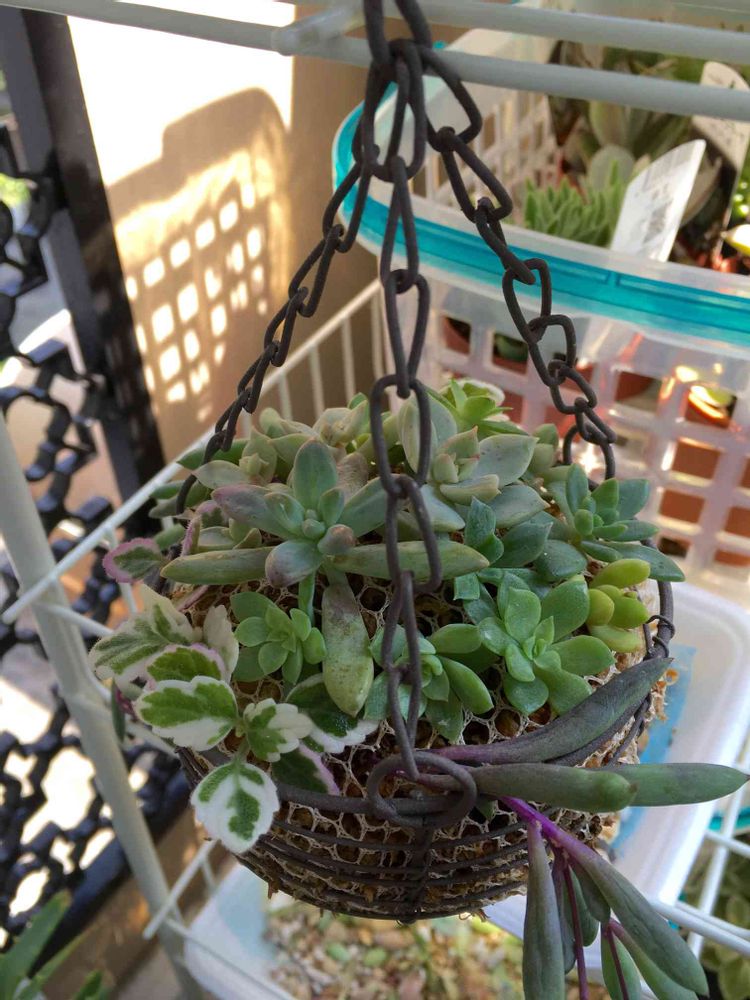 多肉は葉挿しから成長したものも使って、成長を楽しめるように小さめのものを隙間を開けて植えてあります。