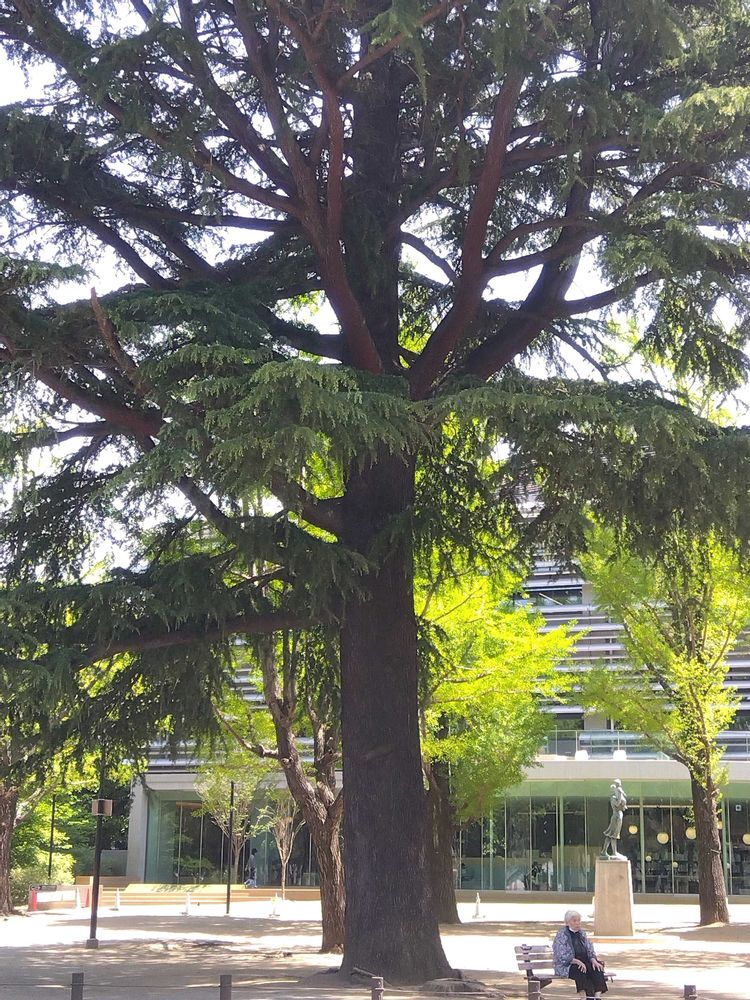ヒマラヤスギの大木とその向こうに若葉輝く銀杏の木