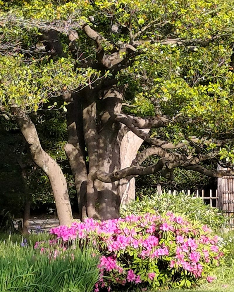 5️⃣ツツジの後ろは何の木なのか、幹がめっちゃ太いです。Google先生はアフリカバオバブの木と…🤣🤣いやそれは無いわ〜!!