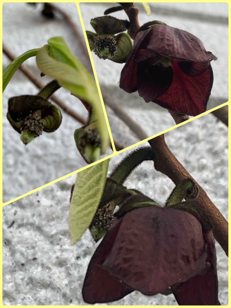 今年はじめてポポーの花が咲きました✌️人口受粉はしてみましたが、花が咲いてから結実は2、3年かかるそうです😊チョコレート色の花は地味ですが、かわいいです🍫ポポー、いつか実りますように🙏😋