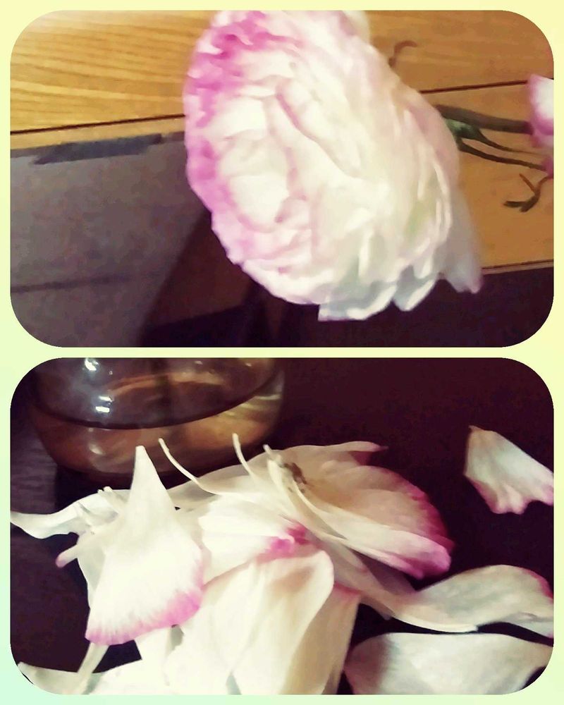 ラナンキュラス ✂️して ビンで 楽しみ 充たされていました。縁どりの淡いピンクのラインが だんだん濃くなってますます悦に入っていた矢先