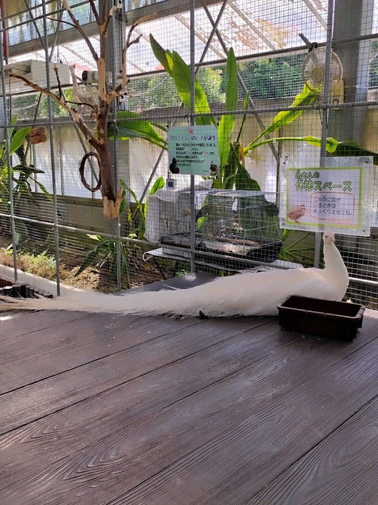 白い羽根の長〜い孔雀も優雅な佇まいだわ。