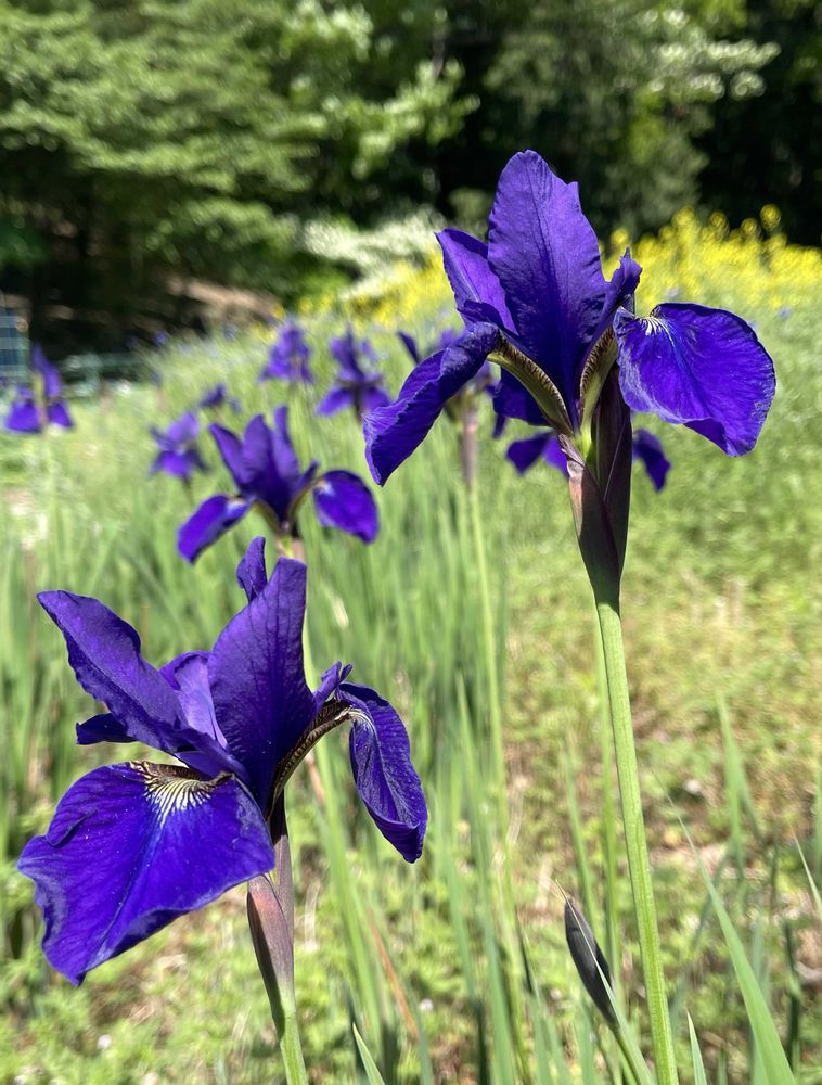 アヤメの花は初夏の感じで、奥に見える新緑と🟣のアヤメが、素敵な景色になっています。