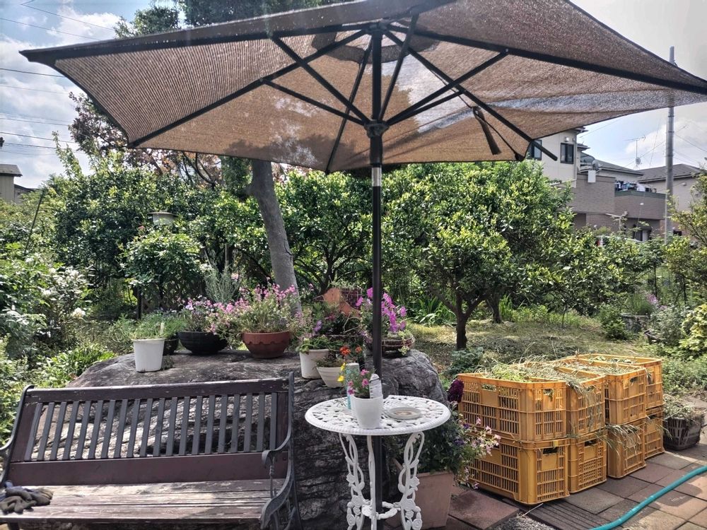 今日一日は雨の予報。毎日庭の草取りです。休憩の傘を出しました。