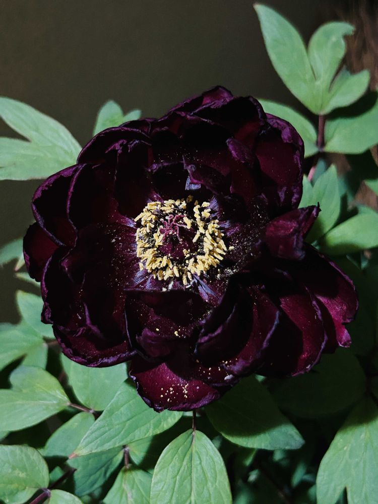 こちら、室内撮影の「黒芳殿(牡丹)」です。昨夜、あまりにも激しいだし風が吹いていたのでハンギング鉢や牡丹達を室内取り込み。すると………日光の下では濃い赤に見えていた黒芳殿の花色が、室内灯の下ではこのように変化。