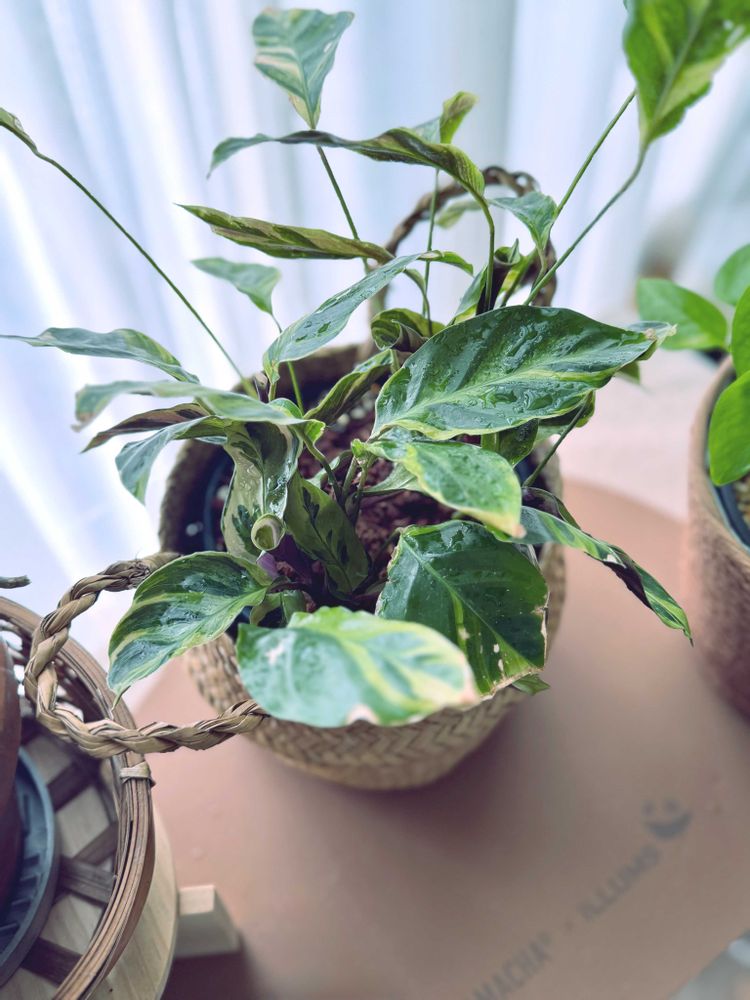 2025.8月に某サイトで購入した【アロカシア チャイ】の 突然変異?なんだろう 購入時、元々有った葉を(1枚目の葉)として、 下から新たな葉が出てきてる状態で到着しました(2枚目の葉) こちらに来て初めて出てきた葉に異変が。。 育て始めて出てきた初めての3枚目、4枚目 (途中から、斑1、斑2、、と続きます) どこまでこの謎の斑入葉が続くのか、 いや止まるのか……記録していきます