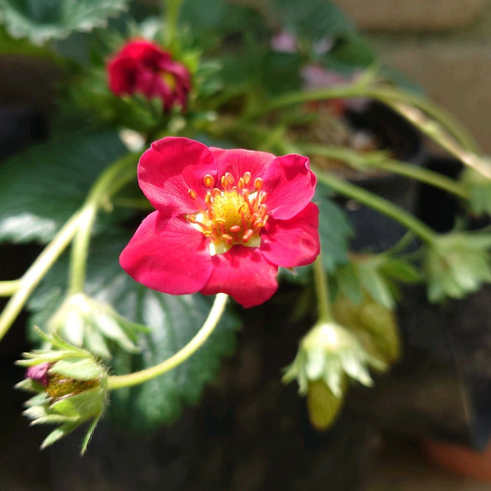 いちご🍓のお花が真っ赤、ピンクは見たことあるんだけど。