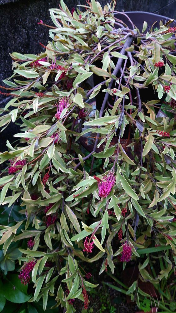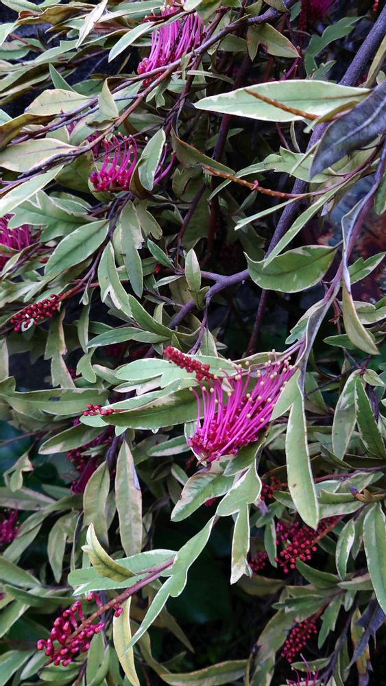 斑入り葉っぱの垂れ下がるグレビレア〜今年も咲始めました✨