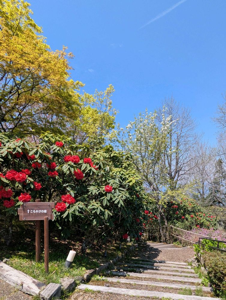赤いシャクナゲに囲まれた階段を降りて行くとベンチが有り小鳥のさえずりに癒されました✨