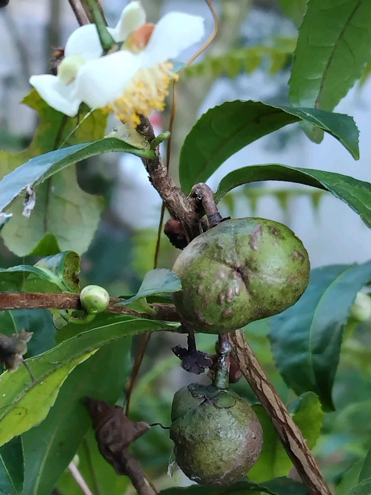 ②去年11月中旬、お花がまだ咲いている時期にもうお茶の実も生っていました🫒