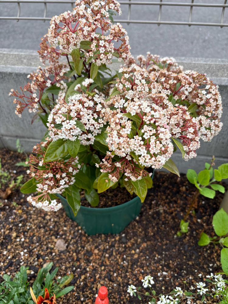 ビバーナムティヌスはこの春、お迎えしました!大きくなりすぎないように、移動できるように鉢を花壇に埋めてます🍀*゜