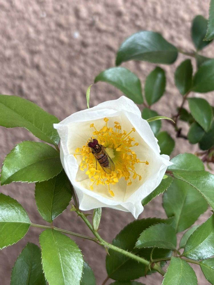 ③ 朝のナニワイバラ、蜜が美味しんですね、しばらく2匹が吸ってました🌼*・🐝🐝