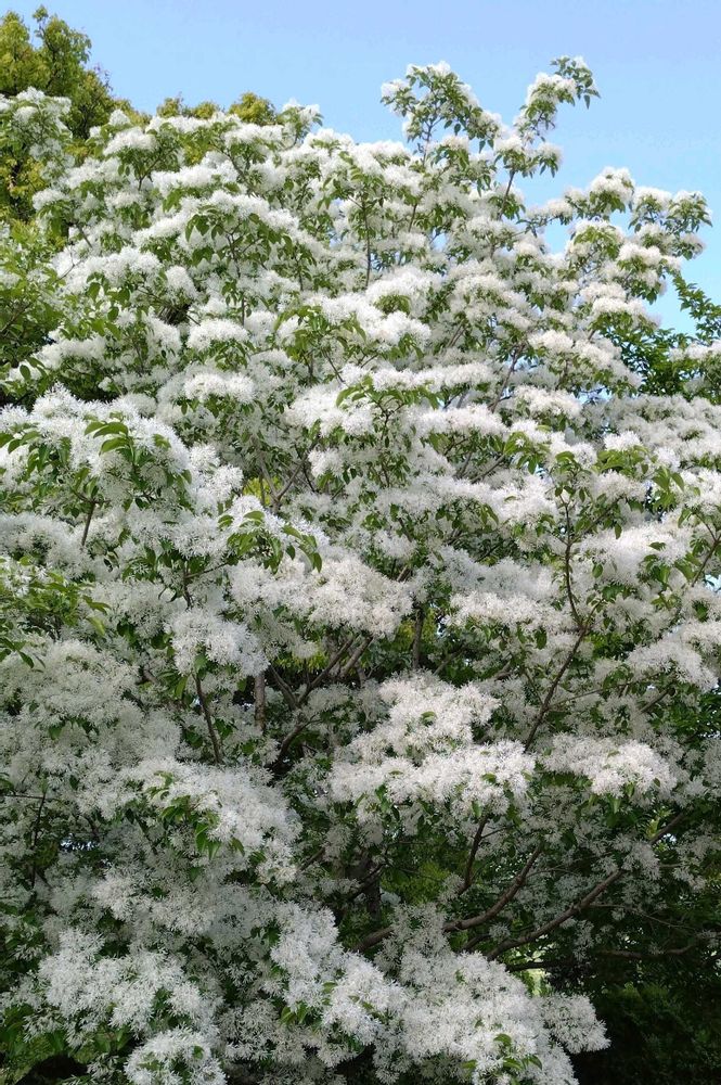 モクセイ科ヒトツバタゴ属の落葉高木。自生地は長崎県対馬と木曽川流域である長野、岐阜、愛知のみで、各地の公園で栽培される。葉は柿の葉に似ていて、若い時には鋸歯があるが成木には鋸歯はない。花期は4〜5月。雄株と両性株があり、どちらも細長く4つに裂けた白い花が枝先に多数咲き、雪が降り積もったように木全体が真っ白になる。両性株には葉腋から果実がぶら下がる。果実は長さ約1㎝の楕円形で秋に黒く熟す。