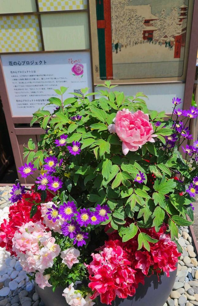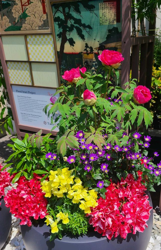 外出先で目にしたカラフルな彩りの寄せ植えです