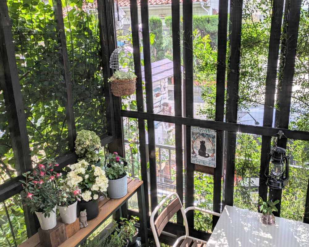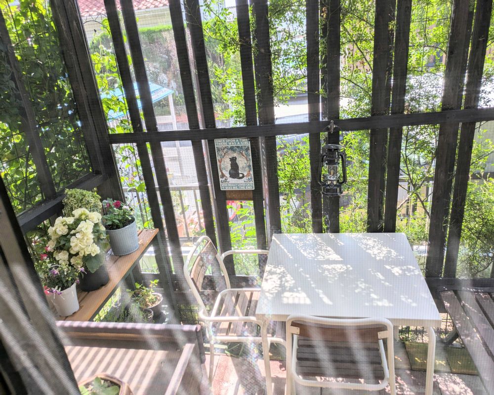 元猫の日向ぼっこ小屋だったDIYテラス、木漏れ日がイイ感じな季節となりました✨