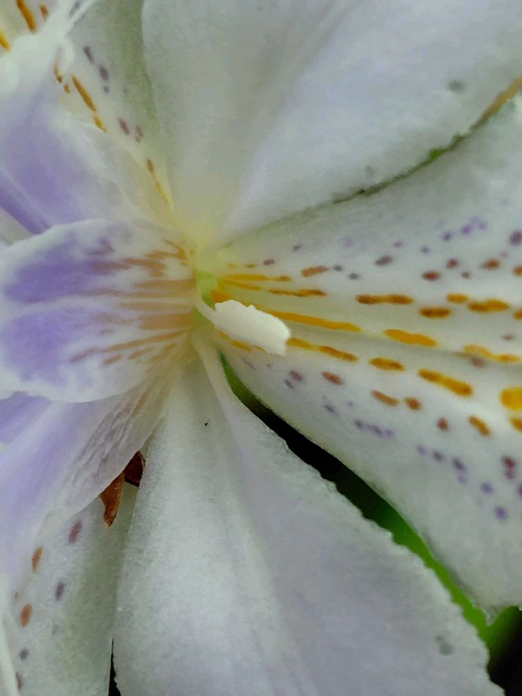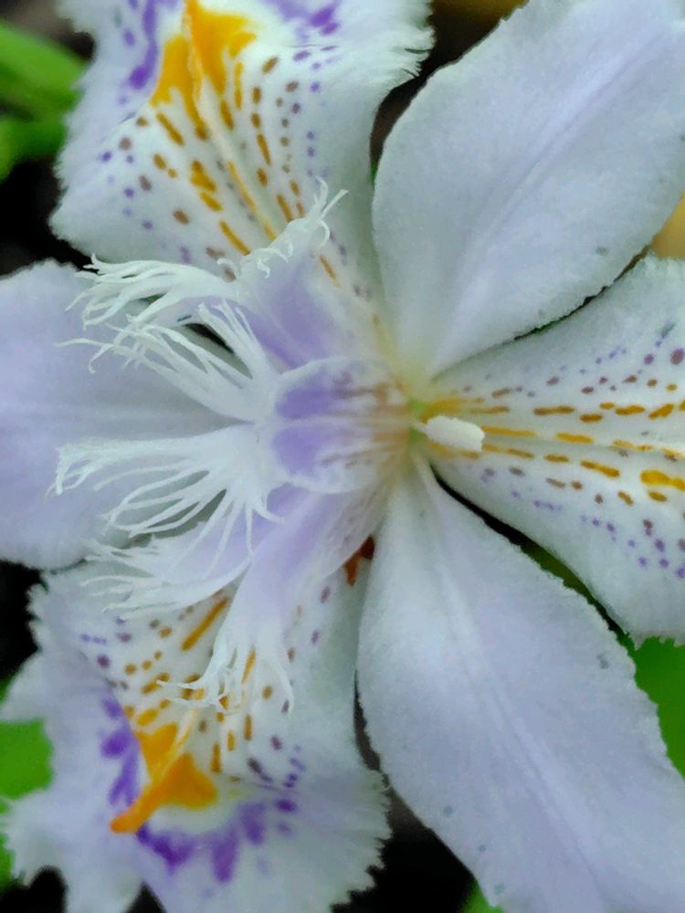 ①外花被3枚の縁は細かく切れ込み、紫色と橙色の模様がある