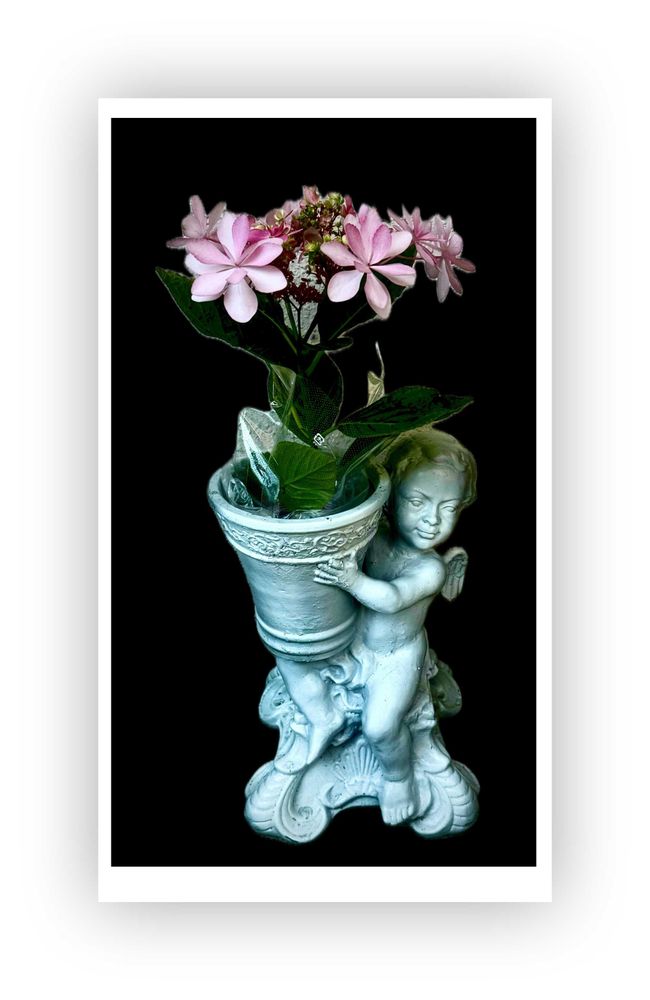 📝この写真画像は、玄関の出入り口に置いてある天使の植木鉢に、鉢植え🪴アジサイの花を丸ごと挿し入れして飾っているものデス🐶