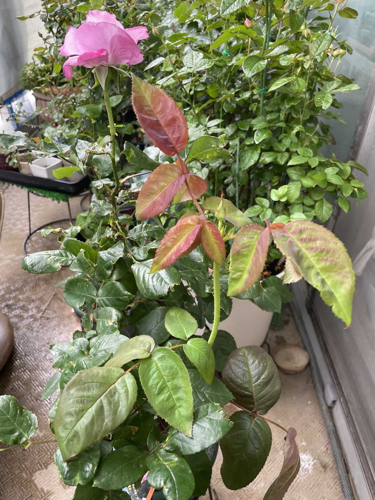 春先の寒さで圧倒的に出遅れたうえに、強風で葉っぱが破れまくり😖こんな過酷な環境で無事に麗しく咲いてくれました。しかも、こちらの心配をよそに、しれっと新枝(シュート)が伸びてるぅ(2枚目)🥰ありがたいことです❣️