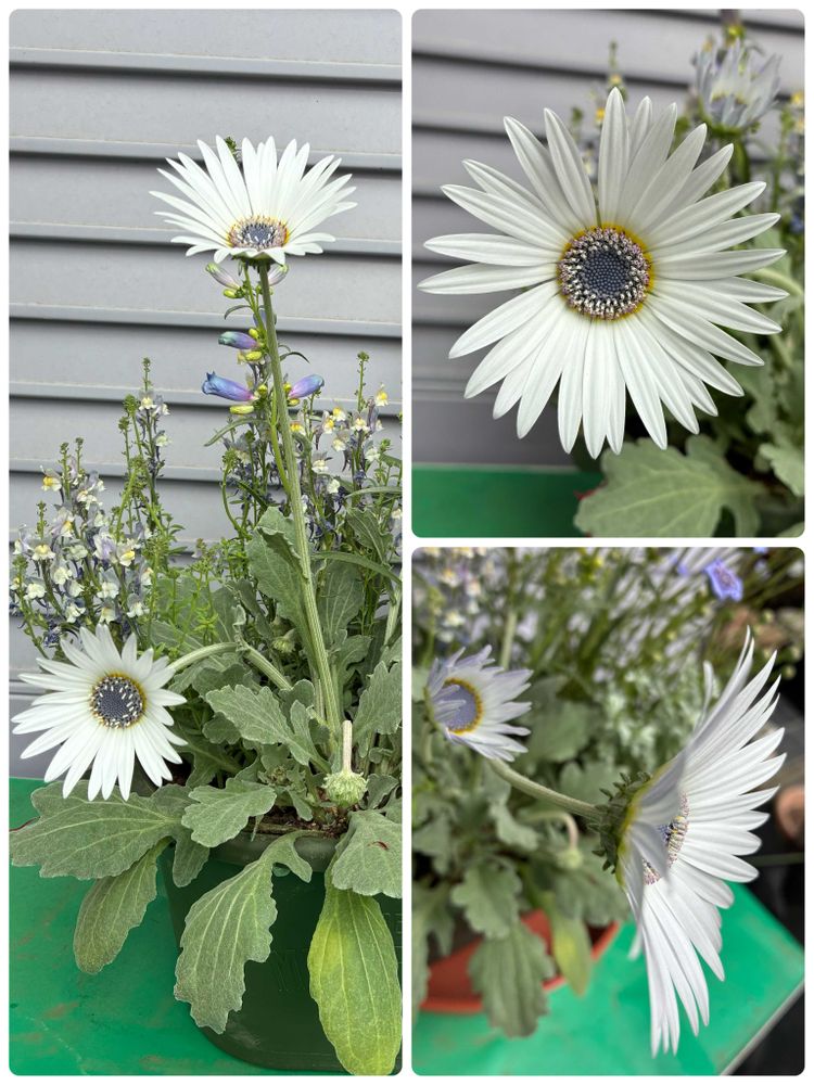落ち着いた雰囲気の寄せ植えいい感じです💜💮💙